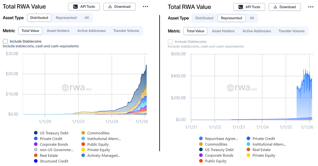 The total value of tokenized assets is going up. Not in one asset class. Across all of them. Treasuries, sovereign debt, corporate bonds, private credit, commodities, institutional funds, stocks, and real estate. Quarter over quarter, the total onchain value has grown steadily, regardless of what crypto prices have been doing.