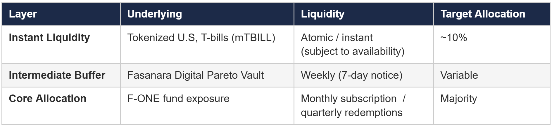 Even with a composable instrument, the collateral still needs a credible liquidity profile. mF-ONE addresses this with a three-layer capital stack that builds progressively faster liquidity into the product.