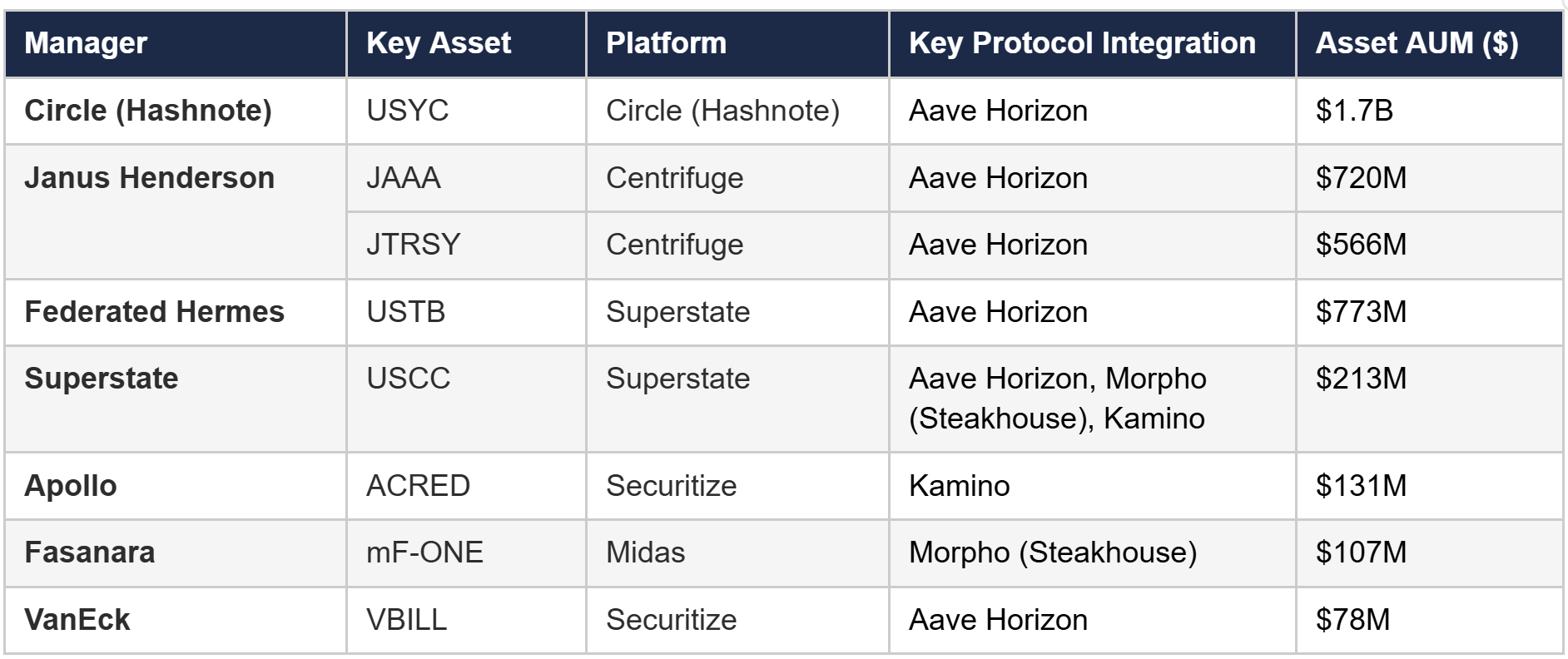 Beyond the lending-native platforms, there are also vault infrastructure providers like Veda that manage significant capital across DeFi yield strategies. Their existing products are oriented toward crypto-native assets, but many are actively exploring integrations with tokenized assets and therefore could be an important channel for institutional asset managers in the near future.