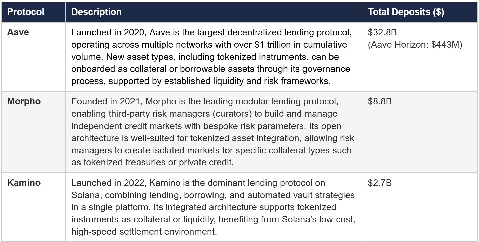 The three lending protocols most active in tokenized asset markets are Aave Horizon, Morpho, and Kamino. Detailed profiles of each protocol are available in Exhibit C.
