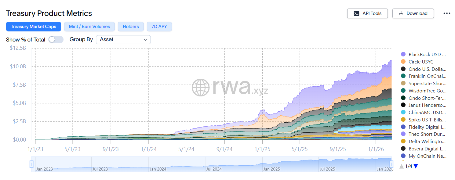 That changed when the Fed hiked the federal funds rate from 0.25% to 5.5% by July 2023. With the crypto bear market depressing borrowing demand, stablecoin yields fell to around 3% and onchain capital began gravitating toward tokenized Treasury products. The product-market fit was immediate, and tokenized Treasuries now represent over $10 billion as of February 2026.