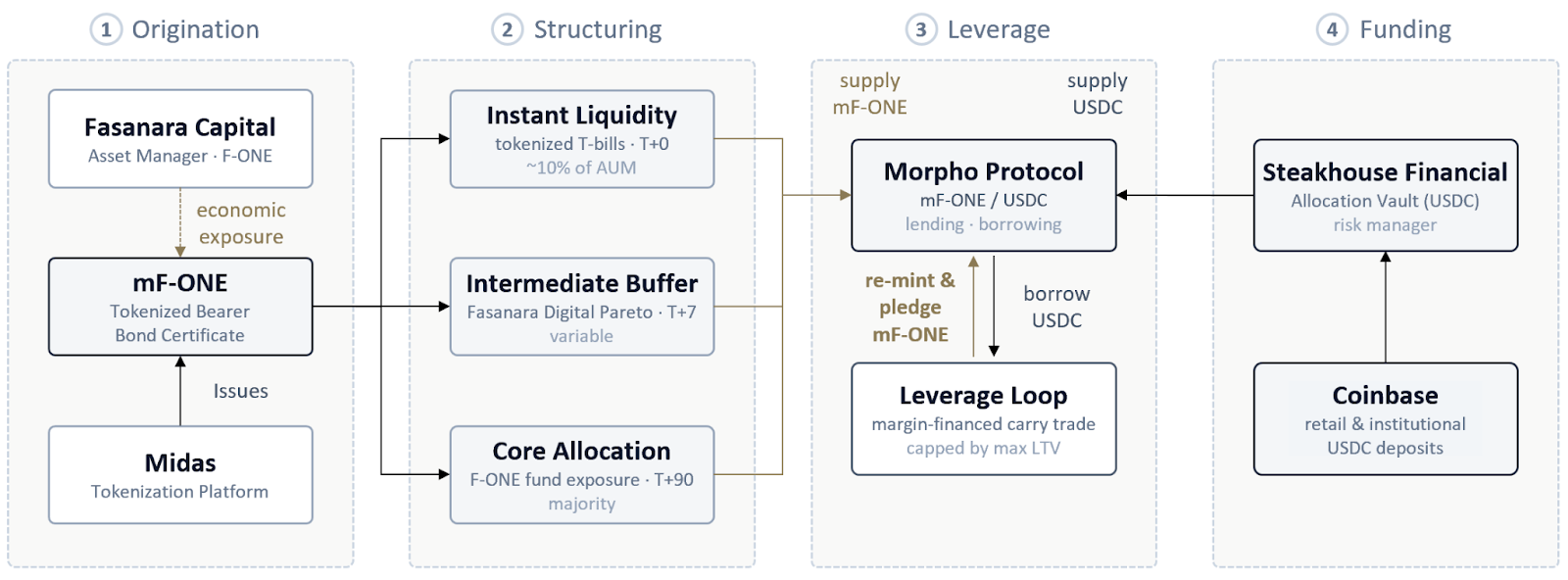 In 2025, Fasanara Capital, a London-based FCA-regulated private credit manager with $5B+ in AUM, partnered with Midas, a German-incorporated tokenization platform, to bring its flagship F-ONE strategy onchain as mF-ONE. The product launched on Morpho with Steakhouse Financial as risk manager and scaled rapidly, reaching over $160M within months, making it one of the largest tokenized collateral markets on the protocol.